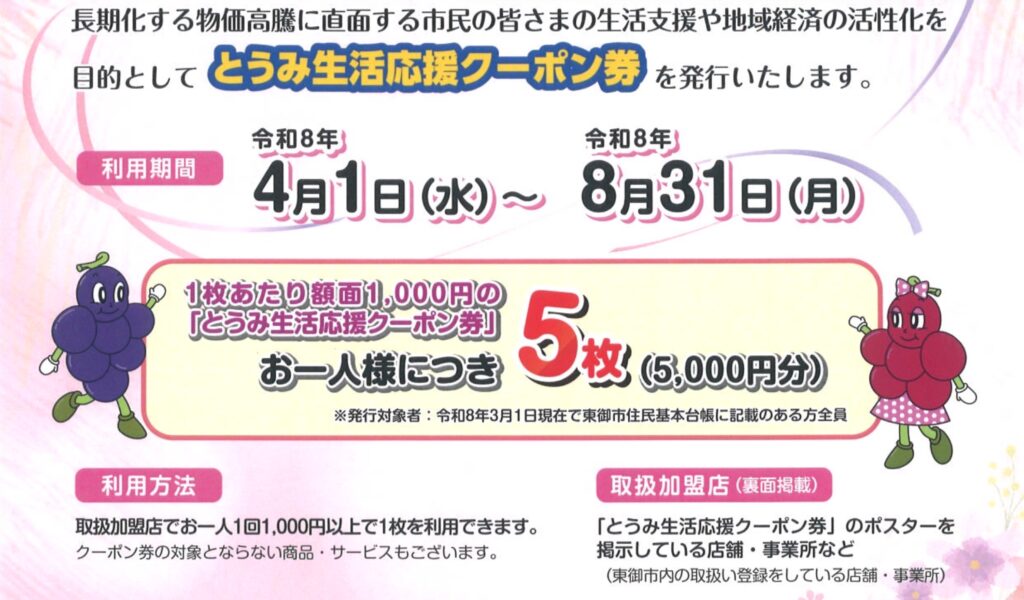 とうみ生活応援クーポン券事業は、長引く物価高騰の影響を受けている市民の皆様の家計を支援するとともに、複数回お買い物やサービスを利用していただくことで「消費喚起」を促し、地域の商工事業者を支えることを目的としています。